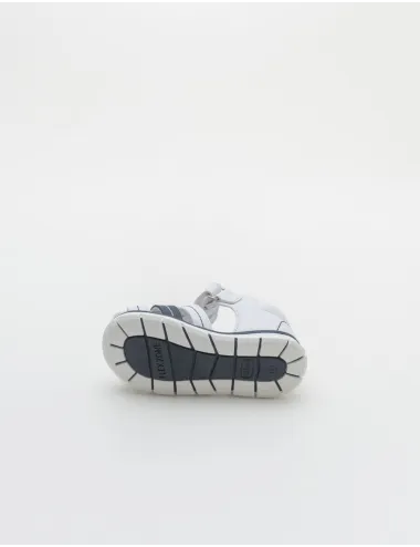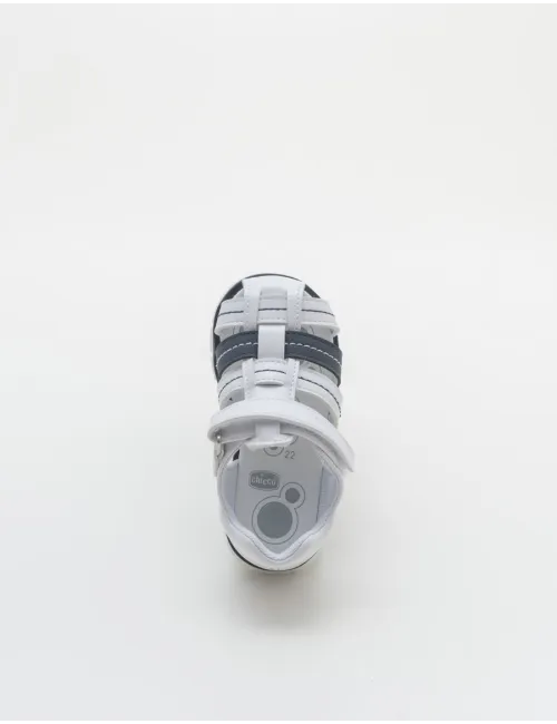 Sandalo da bambino primi passi a punta chiusa dallo stile formale con dettagli di colore blu. Forma arrotondata, regolabile con velcro. "Flex-zone" suola con linee di flessione per garantire la naturale flessibilità del piede. "Impronta Naturale Chicco" : l'esclusivo sottopiede che asseconda il naturale sviluppo dell'arco plantare. Tomaia in ecopelle, interno in tessuto e suola in gomma. Suola: 1 cm