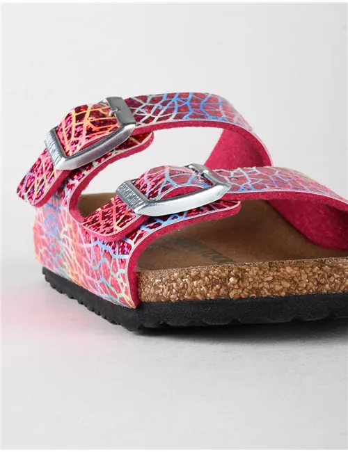 Sandalo bimba con stampa olografica fucsia e galvaniche argento. Listini con doppio cinturino regolabile. Grazie allo speciale cuscinetto in schiuma, il morbido plantare offre una comodità eccezionale ed è una vera coccola per i piedi durante tutto il giorno. La tomaia è in Birko-Flor®, un materiale sintetico resistente all’usura e delicato per la pelle, e presenta un effetto pelle nabuk pregiata e anche tessuto e colore sono davvero simili a quelli della vera pelle. Sottopiede fussbett anatomico. Tomaia in ecopelle, interno in pelle e suola in gomma. Vegan.