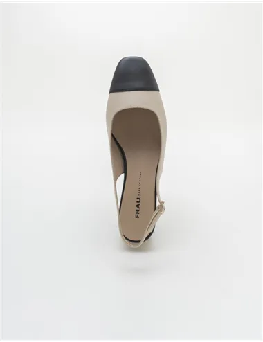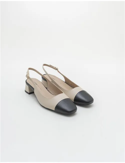 Décolleté da donna in nappa colore vanilla e nero. Sottopiede imbottito in pelle. Fondo in gomma antiscivolo. Chiusura con laccetto e fibbia regolabile sul tallone. Tomaia e interno in pelle e suola in gomma. Tacco:4,5 cm