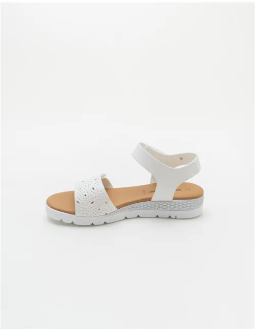 Sandalo da donna colore bianco. Tomaia traforata. Doppia chiusura con strappo alla caviglia e sulla tomaia. Tomaia in ecopelle, interno in pelle e ecopelle e suola in gomma. Suola: 3,5 cm
