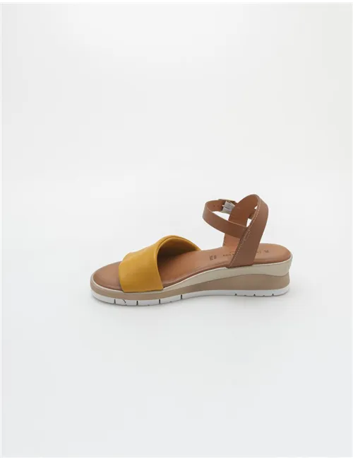 Sandalo da donna colore ocra-cuoio. Chiusura alla caviglia con fibbia regolabile. Tomaia e interno in pelle e suola in gomma. Suola: 4,5 cm