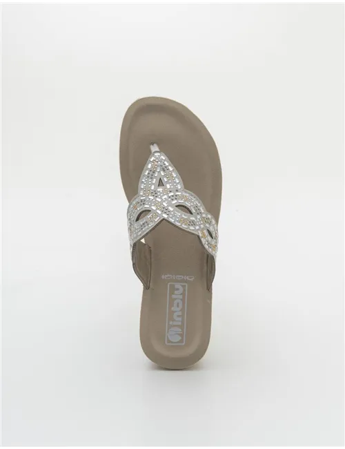 Ciabatta aperta a infradito da donna colore ghiaccio. Tomaia impreziosita da brillantini argentati e bronzo. Tomaia e interno in ecopelle e suola in gomma. Suola: 4 cm