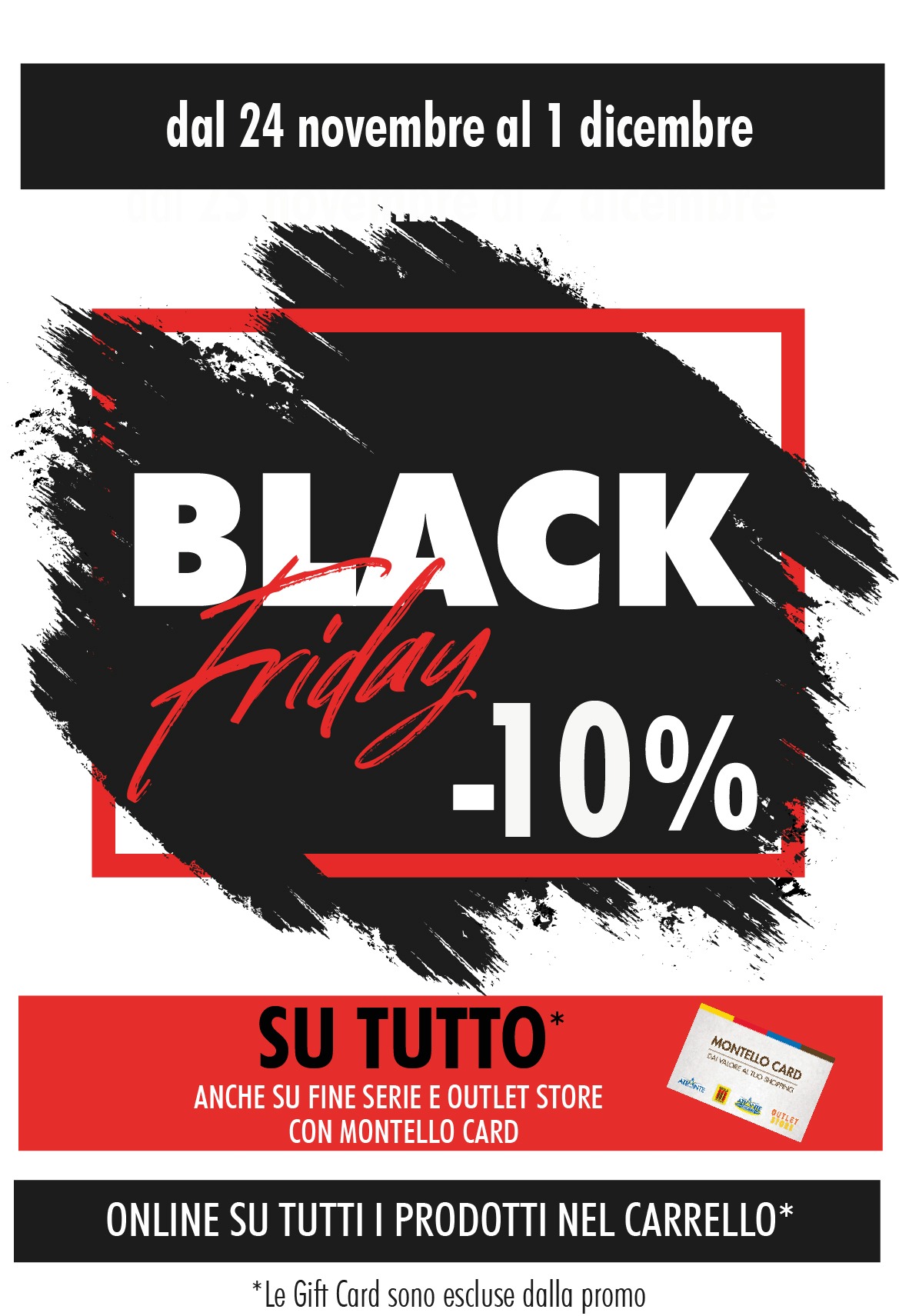 Un Black Friday MODERATO per rispetto e coerenza nei confronti dei Clienti che acquistano PRIMA del BF e che acquisteranno DOPO il BF. Lo sconto del 10% è su tutti i prodotti presenti in negozio, compresi quelli nei reparti Fine Serie e negli Outlet Store per tutti i Clienti titolari di Montello Card. Sono ESCLUSE dalla promo le Gift Card.