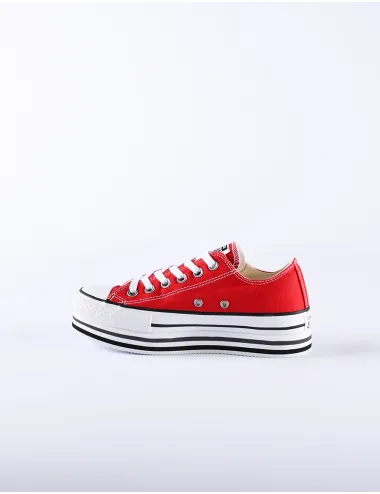 Sneaker rossa platform, tomaia in tela, interno in tela, suola in gomma con disegno strisce antracite e nero.