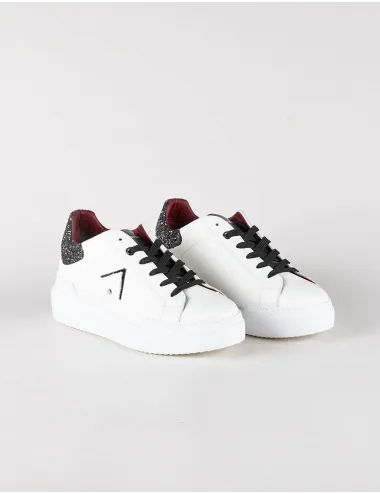 Sneaker bianca con inserti scamosciati ed effetto crackle. Contrasti viola, tiffany, argento e maculato. Sottopiede estraibile ed interno in spugna di cotone. Tomaia in ecopelle e tessuto, interno in tessuto e suola in gomma